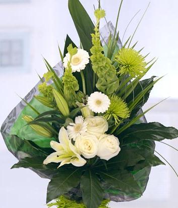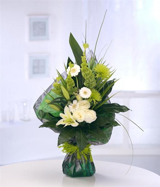 An unusual hand-tied upright bouquet with cream Lilies, cream Roses, cream Mini Gerbera complemented by vibrant green Chrysanthemums and foliage. Beautifully packaged and presented in an aquapack for instant display.