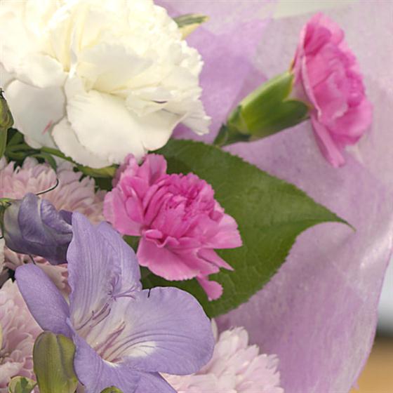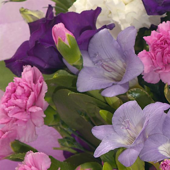 A stunning selection of pink and purple Roses, Freesias, Lisianthus and Carnations. This Luxury Bouquet could be the ideal gift to celebrate Wedding Anniversary or an Engagement but could also be the ultimate romantic gesture to your loved one.