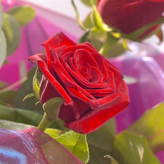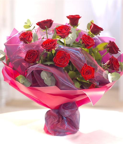 A sumptuous hand-tied bouquet of 12 best grade red Roses in luxury wrapping, delivered in water for freshness.
