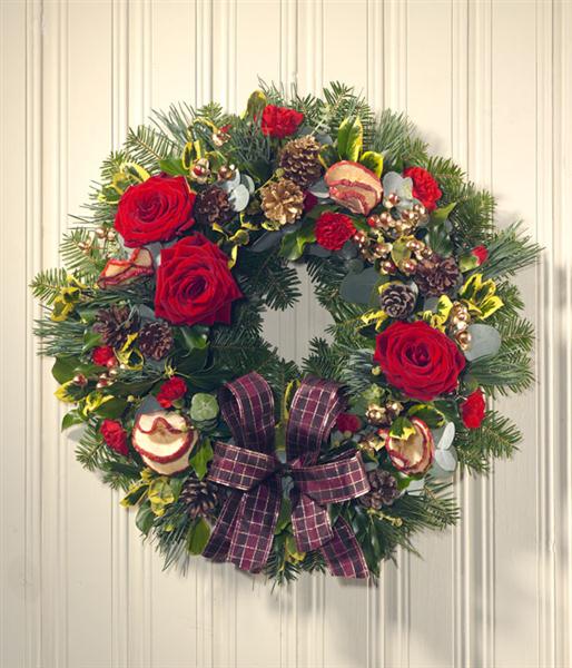 Make a real impression this year with a traditional Christmas Door Wreath. Beautifully crafted with rich red Roses, Pine Cones and Holly, complete with dried apple slices for a classic yuletide welcome home.