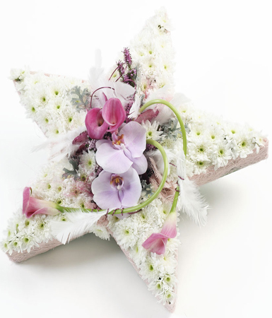 Massed star tribute in white and pink with orchid spray.