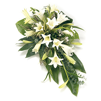 A classic and stylish single ended spray of Longiflorum Lilies and complementary foliage. Size: 69cm (27").