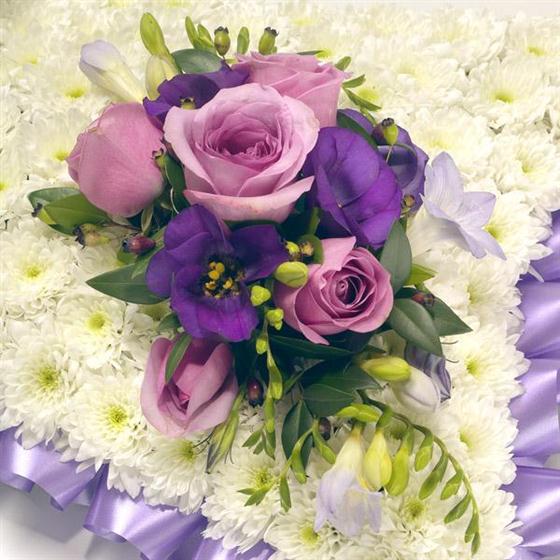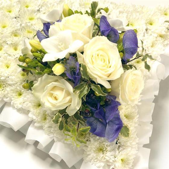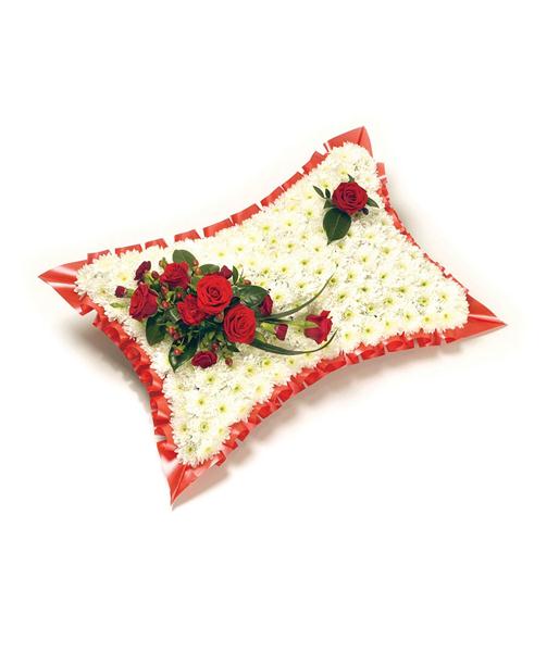 A classic white Chrysanthemum based pillow with ribbon edge. Featuring Roses, Carnations, Hypericum and complementary foliage. Size: Height - 33cm (13") Length - 51cm (20").